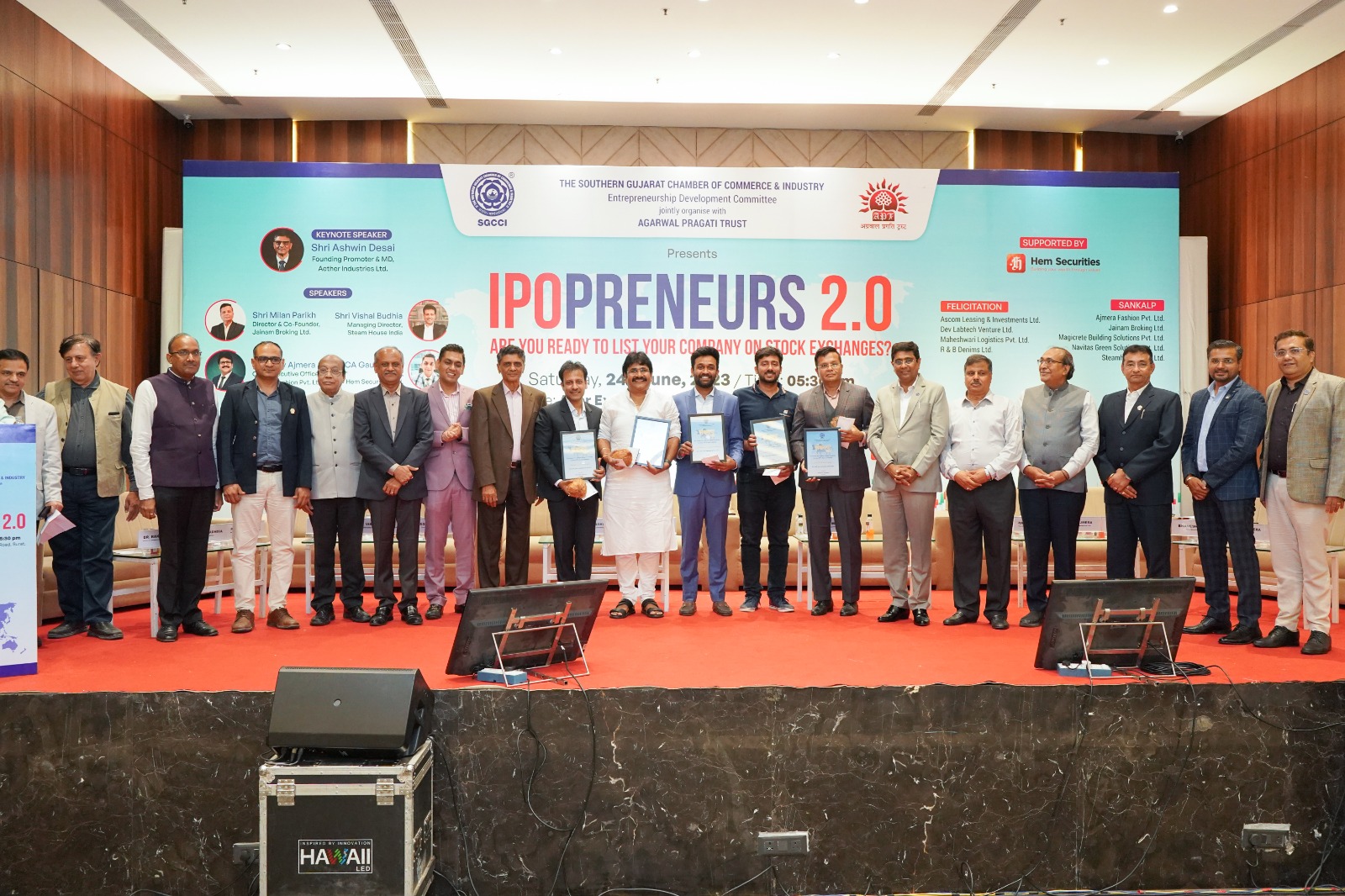 સુરત. ધી સધર્ન ગુજરાત ચેમ્બર ઓફ કોમર્સ એન્ડ ઇન્ડસ્ટ્રી અને અગ્રવાલ પ્રગતિ ટ્રસ્ટના સંયુકત ઉપક્રમે શનિવાર, તા. ર૪ જૂન ર૦ર૩ ના રોજ સાંજે પઃ૩૦ કલાકે અગર એકઝોટિકા, ડીપીએસ સ્કૂલ પાસે, ડુમસ રોડ, સુરત ખાતે ‘આઇપીઓપ્રિન્યોર્સ ર.૦’નું આયોજન કરવામાં આવ્યું હતું. જેમાં મુખ્ય વકતા તરીકે એથર ઇન્ડસ્ટ્રીઝ લિમિટેડના ફાઉન્ડીંગ પ્રમોટર એન્ડ મેનેજિંગ ડિરેકટર અશ્વિન દેસાઇ ઉપસ્થિત રહયા હતા અને ઉદ્યોગ સાહસિકોને સંબોધન કર્યું હતું.