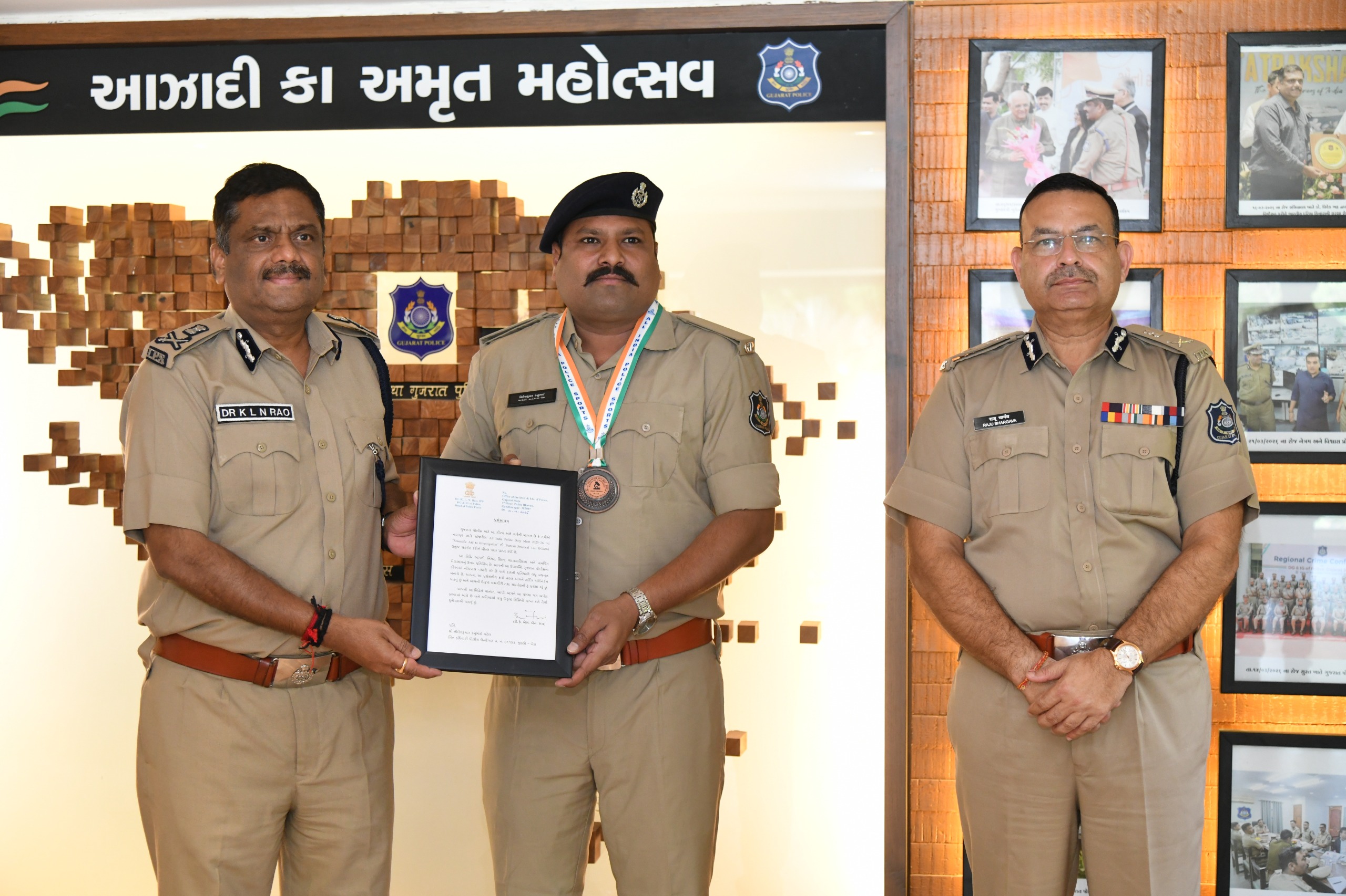 આજે રાજ્યના પોલીસ વડા (DGP) શ્રી કેએલએન રાવે ગાંધીનગર સ્થિત પોલીસ ભવનમાં પોલીસ ડોગ ‘ચેક’, તેના હેન્ડલર રમેશ ખાંટ અને પોલીસ ડોગ ટ્રેનિંગ કન્સલ્ટન્ટ કર્નલ ચંદનસિંહ રાઠોડને મળી આ નોંધપાત્ર સિદ્ધિ બદલ અભિનંદન પાઠવ્યા હતા.