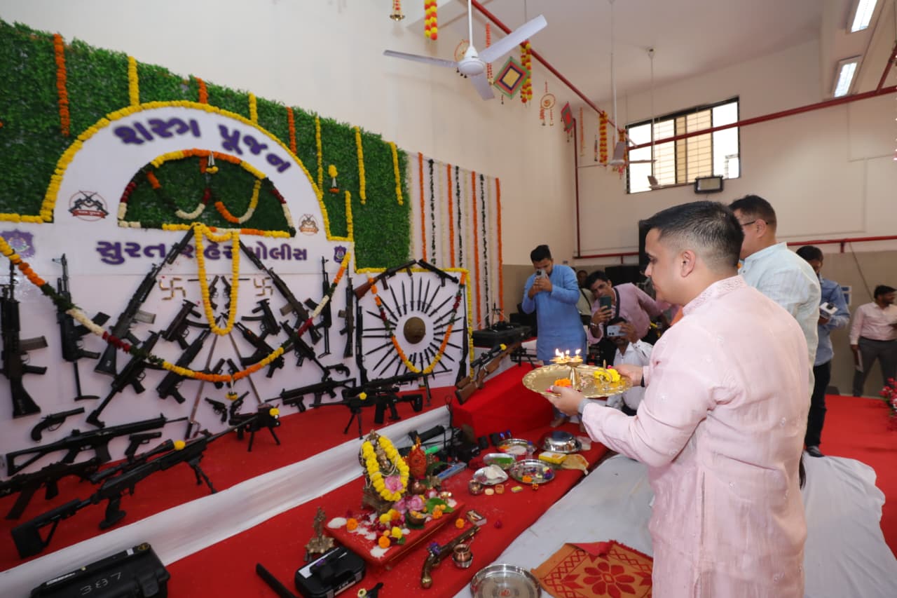 સુરત: વિજયાદશમીના પાવન અવસરે સુરત શહેરના પોલીસ હેડકવાર્ટર ખાતે ગૃહરાજ્યમંત્રી હર્ષ સંઘવીએ પોલીસ જવાનો સાથે શાસ્ત્રોક્ત વિધિ અનુસાર શસ્ત્રપૂજન કર્યું હતું. ગૃહરાજ્યમંત્રીએ રાજ્યના નાગરિકો, સૌ સુરક્ષા કર્મીઓને વિજયાદશમીની શુભકામનાઓ પાઠવતા જણાવ્યું કે, દશેરા એટલે અસત્ય પર સત્ય, આસુરી વૃત્તિઓ પર દૈવી શક્તિનું વિજય પર્વ છે.