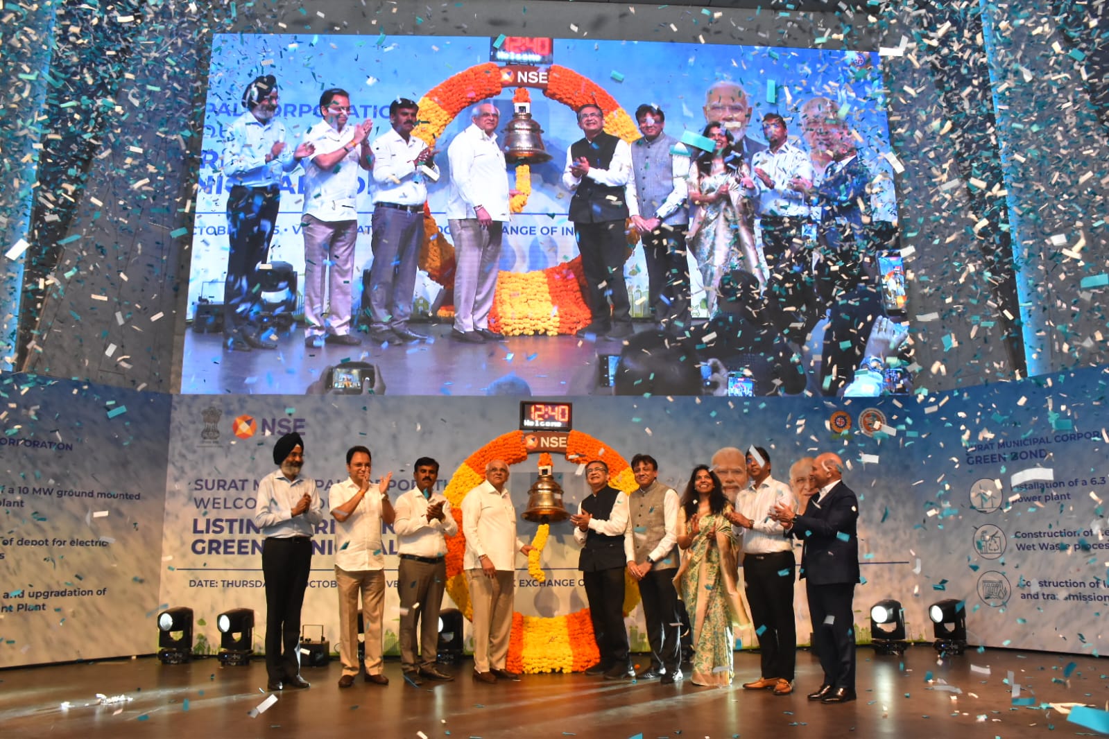 મુખ્યમંત્રી ભુપેન્દ્ર પટેલે મુંબઇ નેશનલ સ્ટોક એક્ષ્ચેજ ખાતે સુરત મહાનગરપાલિકાના મ્યુનિસિપલ ગ્રીન બોન્ડનું બેલ રીંગિંગ કરીને મેયર દક્ષેશ માવાણીની ઉપસ્થિતિમાં લીસ્ટિંગ કરાવ્યું હતું.